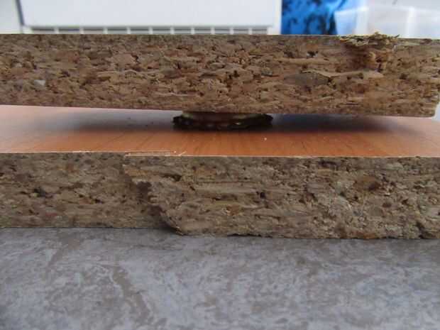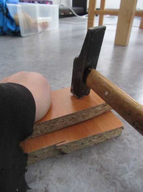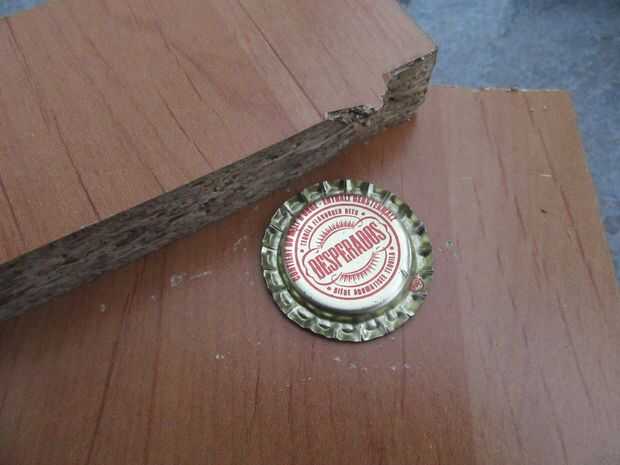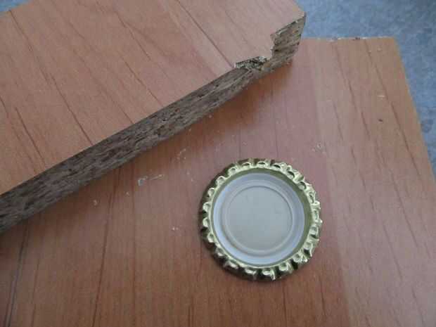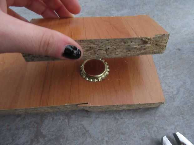 Luego tomar la madera y colocar la tapa entre las dos piezas. Mantenerla y un martillo en él. Asegúrese de que usted martilla uniformemente, no sólo en un lado (si no, la tapa será retorcida y deformada). Si piensas que estás acabado, echar un vistazo a la tapa; Si lo desea, usted puede proceder al siguiente paso, si no, martillo en otra vez.