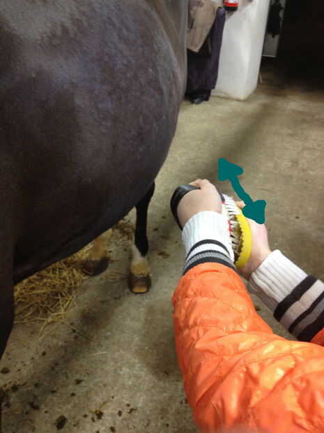 Si el caballo está muy sucio que se recomienda que utilice el cepillo plástico azul primero que eliminas la suciedad dura en la piel de caballos. No utilice este cepillo en las piernas o la cabeza del caballo.