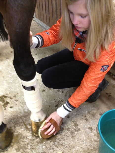 Cuando haya completado este paso podría dar cuidado a los cascos del caballo. Cubrir cada uno de los cascos con una broca pequeña de aceite en el interior y el exterior. Esto evitará que los cascos de la desecación.