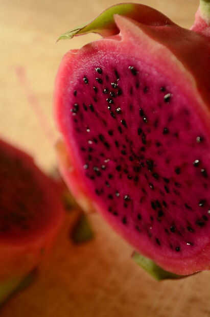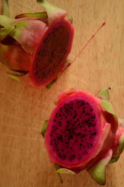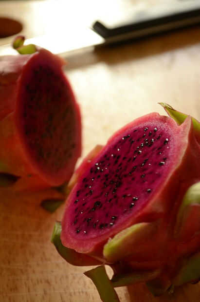 Pitahaya y mango es una combinación interesante, pero en este trío de platos de desayuno, tiene un sabor increíble! Pitahaya a veces se llama 'apple cactus' porque es el fruto de un cactus. Para obtener más información acerca de la pitahaya, véase mi