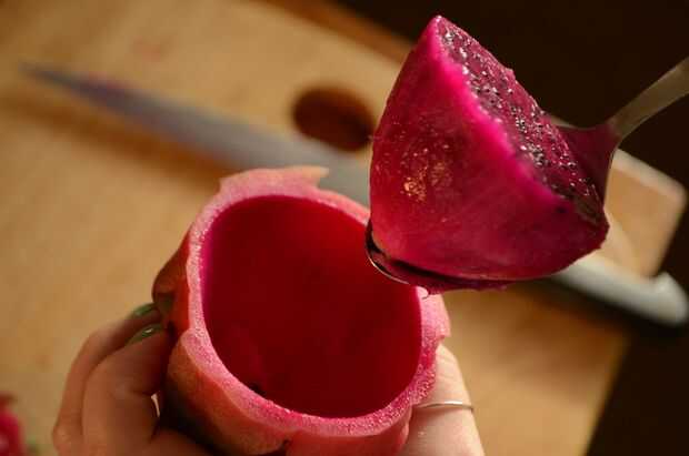 Para hacer cubos de la pitahaya, trabajar poco a poco una cuchara entre la carne y la piel para liberar la mitad de la carne. Gire el hemisferio de carne boca abajo sobre un Tajo (por lo que parece una bóveda) y dados en cubos como podría cortar un vegetal.