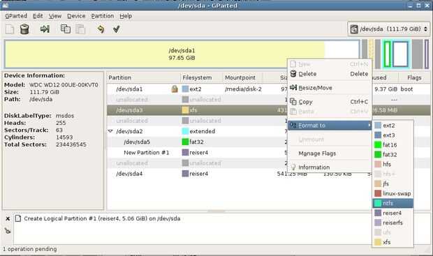 GParted se abrirá en una ventana como la siguiente imagen. Como se muestra, haga clic derecho sobre la unidad USB (normalmente marcada como sda1) y elija "Formato a" y luego haga clic en "Ext2" (no ntfs, como se muestra en la imagen).