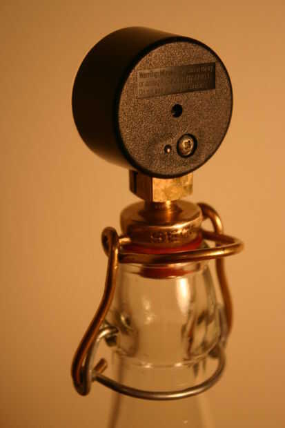 Para mí, la decisión es estética: me gusta el aspecto de la cerveza de la fermentación en vidrio.  Así que quería construir una forma para monitorear la presión en una botella de fianza superior sin sacrificar la apariencia.  Estaba realmente contento con el producto, creo que ha un steampunk agradable a él.  Dicho esto, este proyecto fue un gran trabajo para un problema que puede resolverse con una botella de plástico pop.