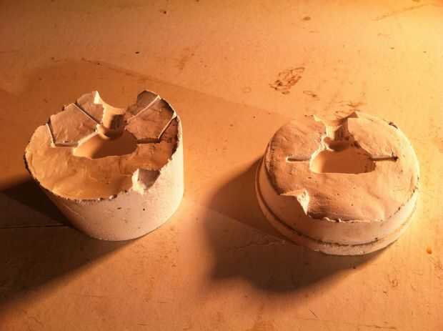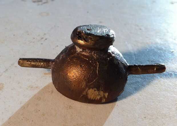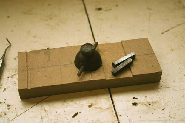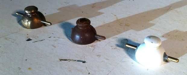 1. toma la tapa de una botella de fianza-top, quitarse el arnés y cortar una varilla de soldadura para caber a través del orificio, sobresaliendo a ambos lados.  Cerrar el orificio con arcilla.