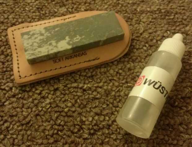 Hablando de afilado, recogí una piedra de afilar de Arkansas de medio grado por debajo de 10 dólares en una de esas tiendas de artículos deportivos highfalutin. Estas son un punto medio si tu va a empacar una sola piedra. Yo use una correa de cuero con regularidad y puede utilizar para strop mis hojas después de sacar un poco de material con la piedra.