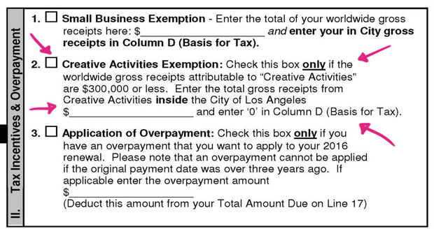 Por ejemplo, la ciudad de Los Angeles tiene una exención de impuestos de negocios creativos. Como hacer menos de $300,000.00 de tus obras creativas en un año calendario, no se debe la ciudad ningún impuesto.