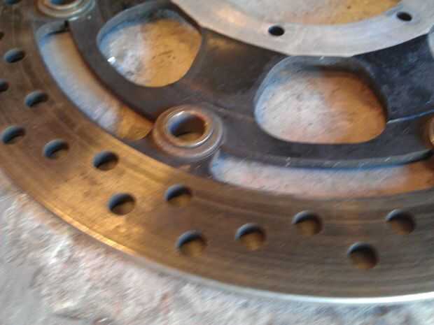 Como se puede ver en la imagen siguiente, en mi caso tengo algunos realmente ligera corrosión de ser junto a piezas de acero (los rotores ellos mismos son de acero inoxidable) y residen la suciedad sólo general y algunas pastillas de freno (no es bueno para nuevos pads).