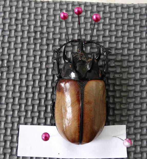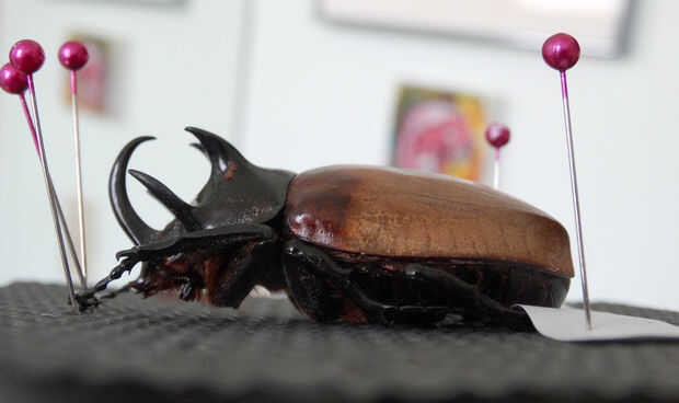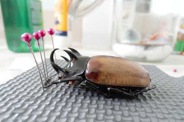 Para minimizar los daños a su muestra, vas a ahorrar con las clavijas que realmente pasar el insecto. Es generalmente útil empujar un perno a través del tórax o abdomen para fijar el insecto mientras trabajo, pero mi chico era pesadamente armado no pude encontrar un buen lugar para hacerlo.