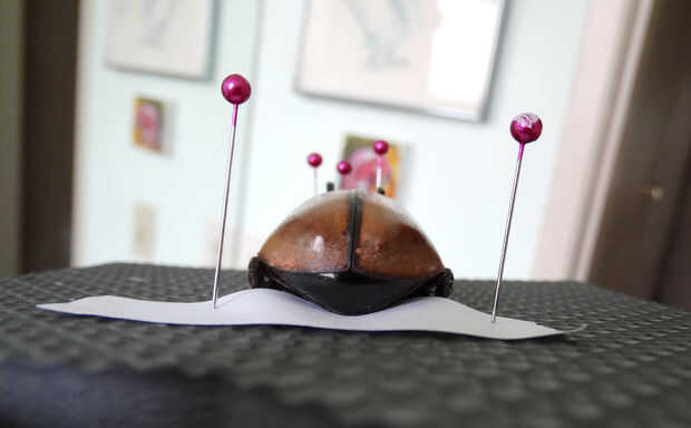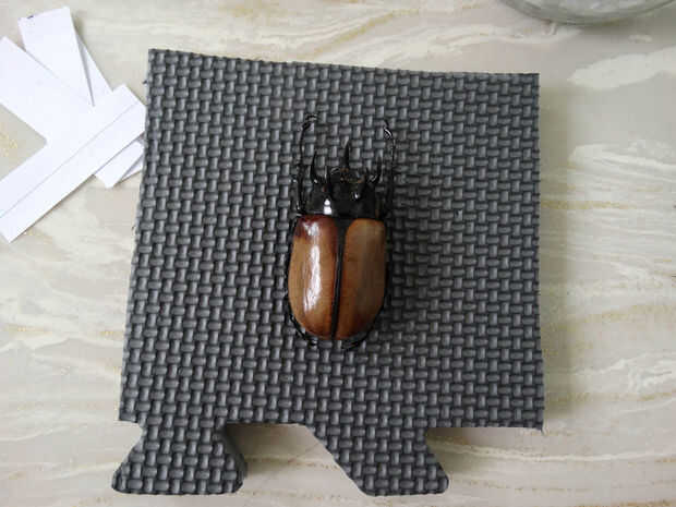 Posiciones de la pierna pueden guiarse con los pernos directamente en la espuma. No va a través de la pierna real elimina el riesgo de romperla. Para el propósito final de la composición de la joyería, arqueó las patas delanteras hacia adentro como si el delanteras "manos" son cruzadas. Si han depositado para la verdadera exhibición entomológica desea las extremidades extendidas.