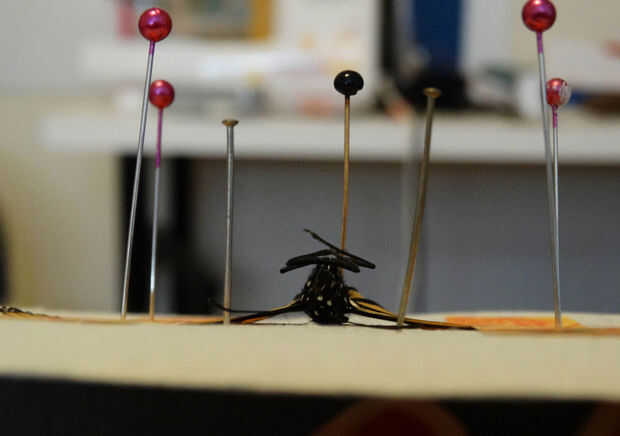Cuando el espécimen es lo suficientemente flexible como para volver a colocar (este escarabajo tomó 2 días para relajarse), podrá utilizar una combinación de clavijas de palo y papel tiras para sostener esa posición nueva para secar.
