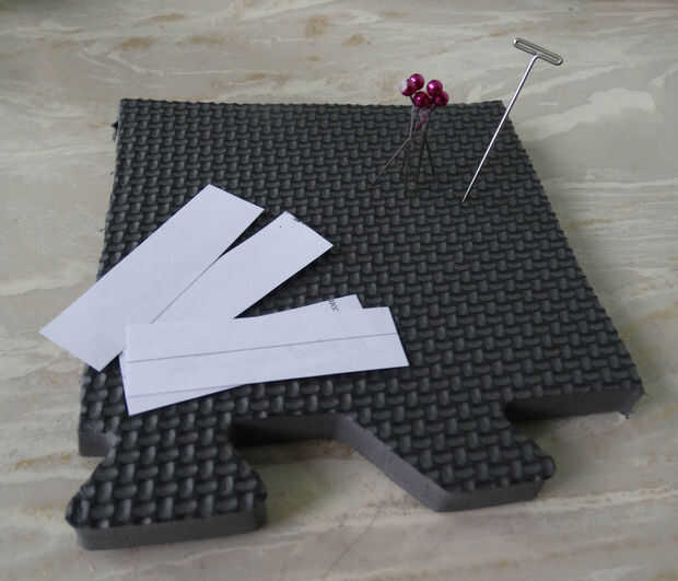 Me deslizo una de mis tiras de papel entre el abdomen y las patas traseras. Asegurar este papel a la espuma con los pernos hace que las piernas pone al ras con la espuma.