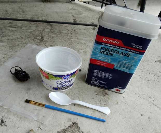 Mezclar un lote muy pequeño de resina de fibra de vidrio, que combina en su envase disponible. Las instrucciones sobre la jarra de Bondo decirle cómo hacer una hornada pequeña realizable mediante bonos 2 cucharadas + 4 gotas de endurecedor con que viene. Esto todavía va a ser más que necesita cubrir un insecto. Cortar la receta por la mitad (1 cucharada + 2-3 gotas endurecedor) y todavía tenía mucho.