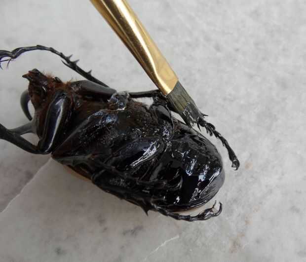 Permitir que la resina al secar varias horas, durante la noche si necesitas ser. Flip y repita los pasos al otro lado del insecto cuando la resina no es pegajosa al tacto. decidí fortalecer sólo la parte inferior y las piernas de mi escarabajo, ya que la parte superior es muy durable a.