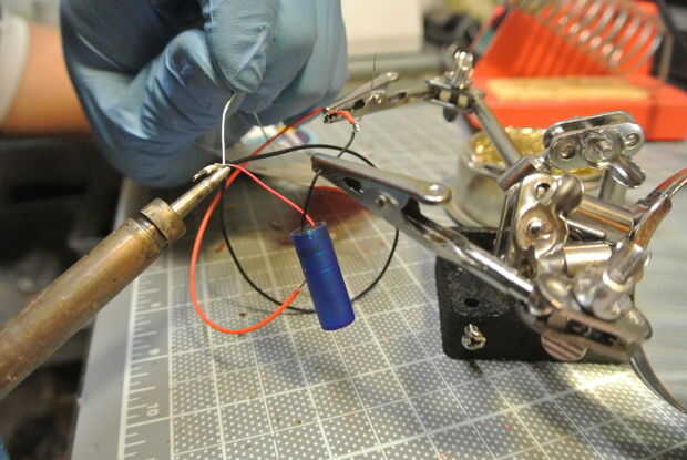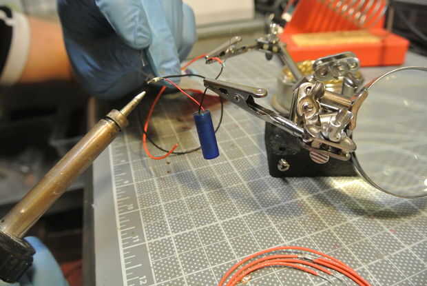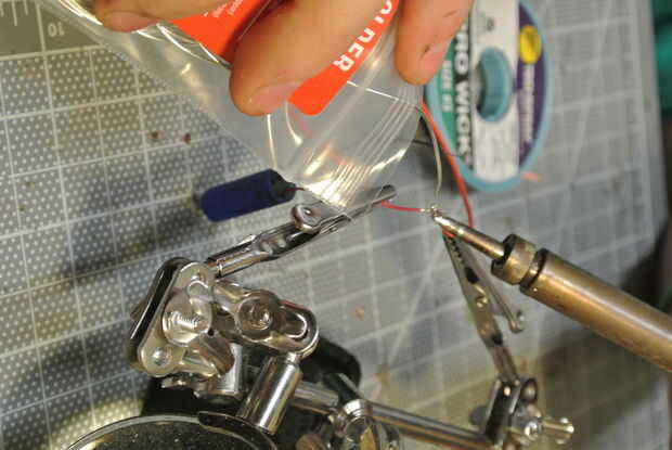 Aplicar la soldadura para el soldador, tomando la soldadura recién fundida a un sistema de los alambres juntos. Asegúrese de que usted permita suficiente de la soldadura a ser derretida en los cables, queremos una conexión segura por lo que podemos garantizar un funcionamiento del motor. Si usted encuentra que usted necesita aplicar la soldadura más, simplemente tomar su soldadura y aplicarlo una vez más a tu soldador, fusión de la soldadura en los cables para reforzar nuestro esfuerzo. Casi inmediatamente después de aplicar la soldadura, enlace el tu lleva a conduce vuelo de su motor, puede soplar en la conexión que se enfríe la soldadura. Se realiza los pasos anteriores para cada conjunto de cables, limpieza de la punta de tu soldador entre cada lazo con su bobina de latón. Cuando no utilice el soldador, asegúrese de volver a colocar la plancha en su titular. Cuando haya terminado de soldadura en conjunto, asegúrese de que para apagar el soldador.