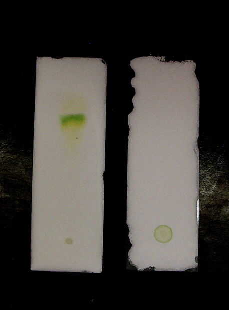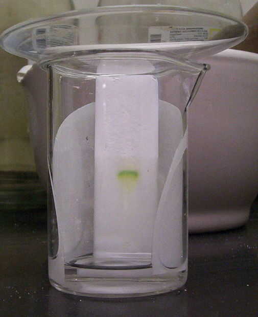 Sentarse y ver como la línea solvente sube la placa y tira los pigmentos junto con él. El verde es la clorofila y deben moverse más hacia arriba de la placa que las líneas amarillas que son los xantofilas.