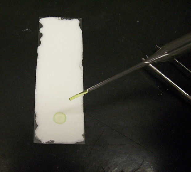 Cuando el solvente es cerca de 0,5 cm de la parte superior de la placa rápidamente sacarlo y marque la línea solvente con un lápiz.