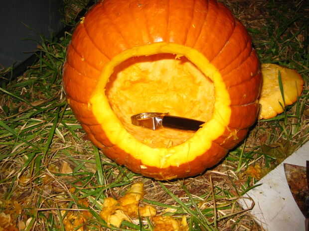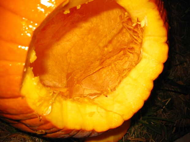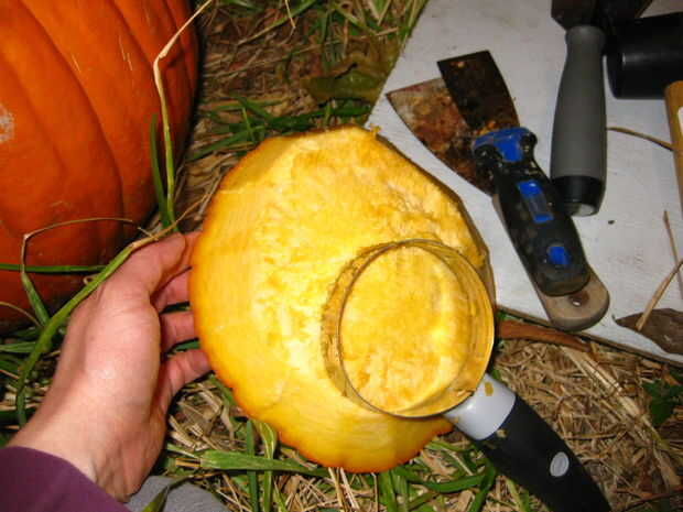 La mejor parte de la máquina de cortar del aguacate es que usted puede ángulo perpendicular de la parte inferior de la calabaza para nivelar el interior para crear un lugar para su fuente de luz. ¿Puedes decir que me gusta destripar calabaza?