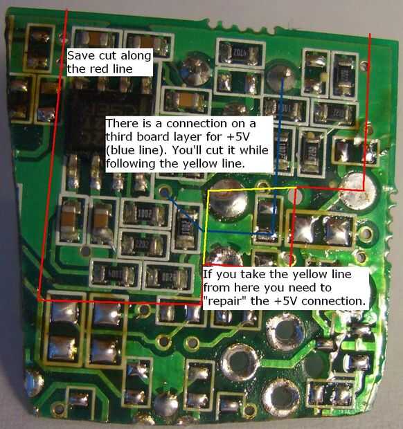Hay un "save" corte que puede encontrar en el cuadro, dibujado como una línea roja. Si se corta que todo funcionará bien después del corte. Usted también consigue algunos agujeros de montaje agradable. Si necesita ahorrar espacio, o el peso, se puede cortar a lo largo de la línea amarilla. Si lo haces también a cortar un alambre que lleva + 5V entre el sensor de pir y el amp op. El cable funciona dentro de la pcb. Parece ser que cuatro capas de pcb. Esto no es problema si sólo lo reemplaza con un pequeño alambre de soldar en las patillas del sensor pir y 8 de la amp op.