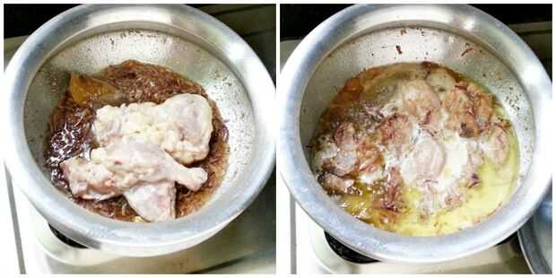 Finalmente agregar el pollo yogur mezclado, especias y mezclar muy bien.