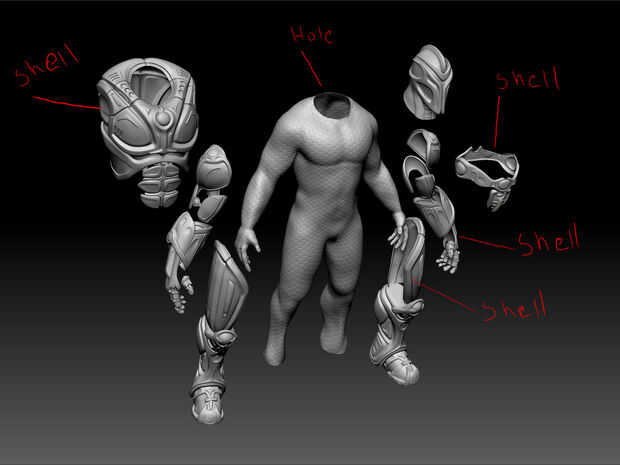 Como se puede ver cuando he creado este personaje, he añadido toda la armadura en la parte superior de la malla de la base por lo que queda la armadura con los agujeros y conchas que es mala cuando impresión 3d. Pero en este instructable voy a mostrarle cómo arreglar eso.