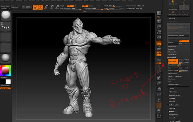 Una de las mayores funciones en zbrush es Dynamsh. Dynmesh le permite remesh tu personaje que es agua firmemente (con sin agujeros) y mantiene todos los detalles. Es muy importante para asegurarse de que el modelo no tiene agujeros ni aviones porque muchas impresoras 3d no aceptará el modelo o imprime mal. Cuando me dynamesh un modelo generalmente voy dynamesh a 2 o 3 millones de polígonos según el detalle del personaje.