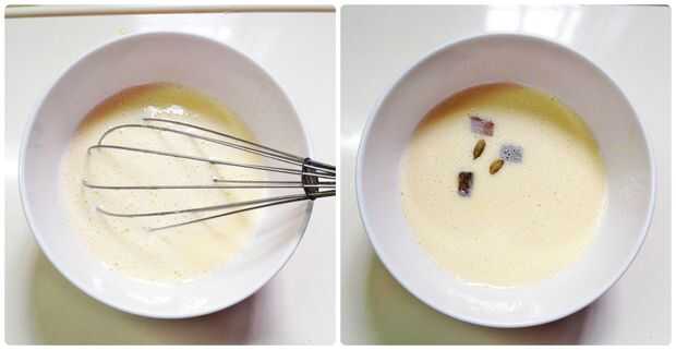 Añadir la leche líquida, el cardamomo y la canela a los huevos batidos. Otra vez batir la mezcla hasta que la leche se mezcla uniformemente.