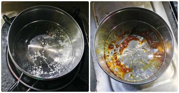 Cuando el azúcar comienza a derretir y se vuelve marrón rápidamente sacar la olla de la cocina.