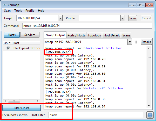 Zenmap lista de todos los hosts activos dentro de su red local. Para encontrar el click de frambuesa Pi las huestes de filtro de botón en la parte inferior del Zenmap y tipo de negro. Ahora la primera línea de la lista debe mostrar la dirección IP de la Raspberry Pi.
