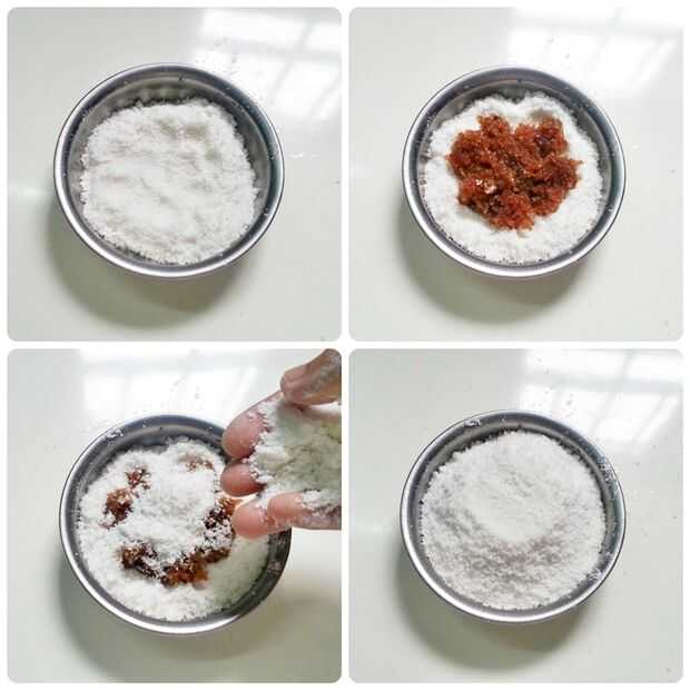 El tazón de fuente pequeño de acero fino y añadir una fina capa de harina de arroz en ella. Añadir que una melaza de pequeña cantidad (1 cucharadita) mezcla de coco rallado a la harina de arroz en un tazón pequeño. Por último espolvorear un poco más harina de arroz en la parte superior de la melaza. Espolvorear suficiente harina para cubrir la melaza.