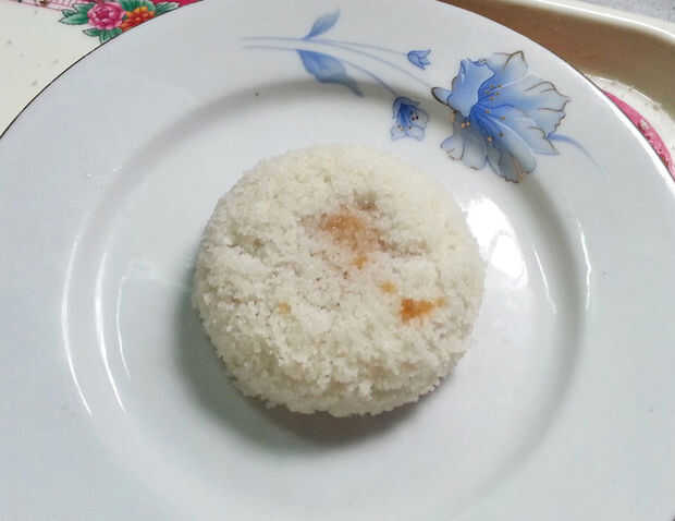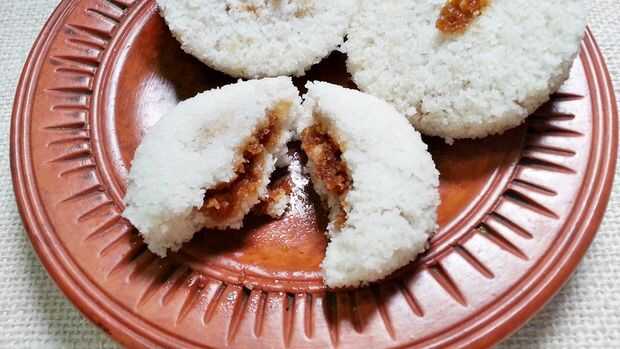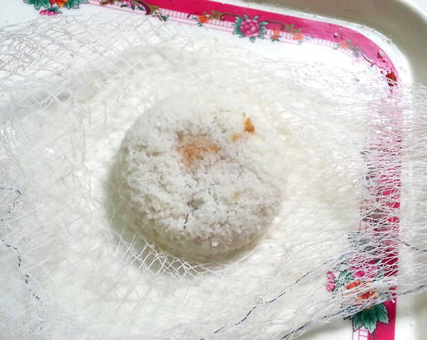 Después de 5-6 minutos las tortas de arroz deberían estar listas. Cuidadosamente saque la tela manteniendo los extremos abiertos y retire el pastel de arroz de él y coloque otro repitiendo el paso anterior.