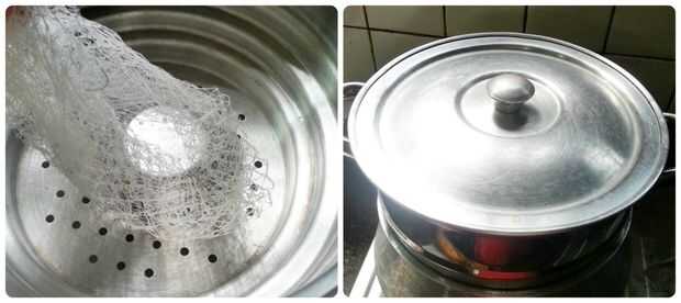 El agua debe ser de vapor ahora. Cubrir el colador y el molde de pastel de arroz al vapor durante 5-6 minutos.