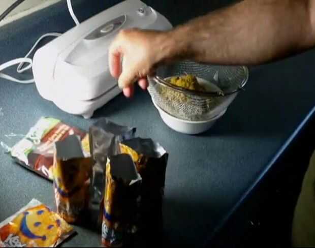 3) utilizando una mezcla de agitación cuchara para separar el polvo en el intestino por debajo dejando sólo los fideos o arroz en el colador.