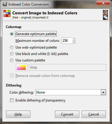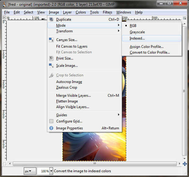 Obtener sólo los ajustes necesarios para este paso podría tomar algunos experimentos así que voy a incluir las imágenes de mis pruebas como vamos. Haga clic en imagen > modo > indexado