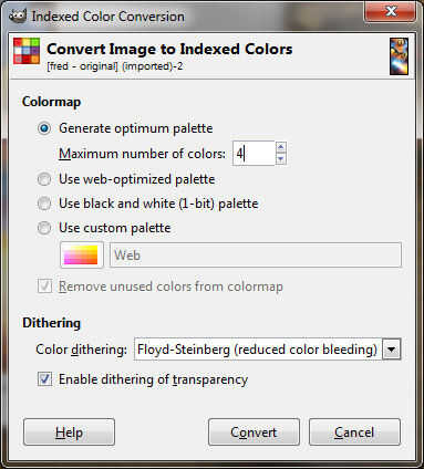 Daré ejemplos más tarde de lo que parecen las diferentes configuraciones, pero por ahora, sugiero comenzar con máximo de 4 colores y permitiendo así como dithering Floyd-Steinberg. La imagen ahora debe verse algo como esto.