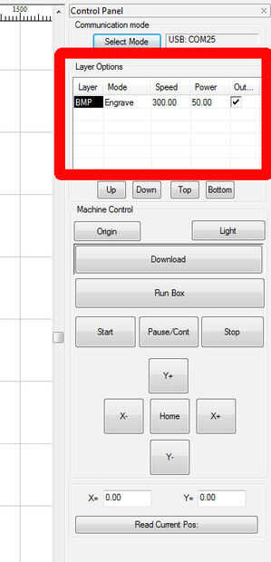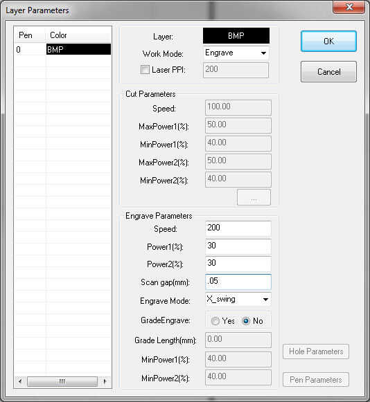 Esta parte es asombrosamente fácil una vez que la obra de arte está preparado correctamente. Abra LaserCAD e importar la imagen jpg. Se ven horrible y distorsionado, confiar en la fuerza. Cosas a destacar están que donde normalmente se ve una muestra de color en la sección "Opciones de la capa" donde elegir la configuración de energía, ahora tiene una fila para "BMP" con el modo a "Grabado". Haga doble clic allí para abrir el menú de parámetros de capa donde configuras tu potencia y velocidad. La sección avanzada irá en detalle cómo surgió con estos valores, pero para este proyecto, cambiar la velocidad a 200, power1 y power2 a 30 y análisis brecha a 0.05 y haga clic en Aceptar.