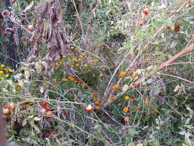 Tire hacia arriba del tomate, calabaza, guisante y plantas de frijol. Si están libres de la enfermedad, los compost. Si alguno está enfermo, descartar por separado. Retire y guarde cualquier jaulas de tomate y las estacas. Cubre camas de fresa con una gruesa capa de heno.