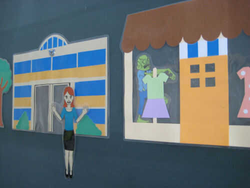 Para enseñar las preposiciones, uso recortes de edificios, objetos y personas. Me gusta usar edificios que tienen grandes ventanales para ver si la gente en ellos. He creado edificios personalizados, como la enseño en la escuela. También puede utilizar fotos de profesores o personajes famosos para hacer más interesante la lección y mostrar cómo se cambia la frase utilizando nombres en lugar de sustantivos generales. Por ejemplo, "Melissa es enfrente de la escuela" frente a "la chica está frente a la escuela". He creado un zombie para hacer la clase más dinámica e interesante mediante la adición de un poco humor negro. Cambiar las posiciones de los objetos y personajes. Por ejemplo, poner a los zombies encima de la muchacha y preguntar "¿Dónde está la chica? Entonces pregunto si el zombie come a la chica, ¿Dónde está la niña?"