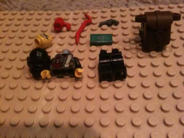 Recoger el torso de ataque de Dino parts.1, 1 par de patas negras, cabeza 1 lego de elección, 1hat o máscara de gas de elección, pata de cabra 1 lego, 1 lego pistola, taza de 1lego, un billete de 100 dólares de lego