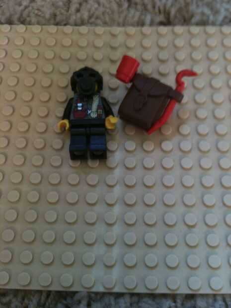 Montar todas las piezas que se reunieron para la mochila. el dinero y pistola interior y correa luego de la taza una palanca a la outside.and ya sabes cómo hacer la minifigura.