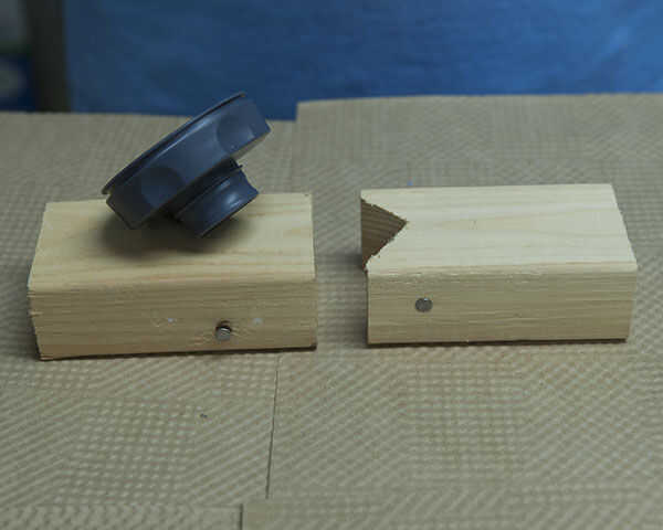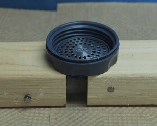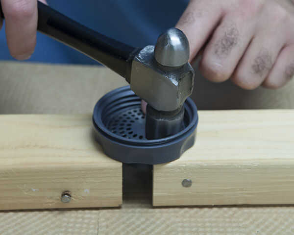 Para evitar dañar el capCAP, usar dos pedazos de madera para apoyar el capCAP invertida. Asegúrese de que lado convexo del protector es hacia arriba (debe ver la palabra "OXO"). Utilizando un pequeño martillo, golpee suavemente el protector en el capCAP hasta que se asiente en la parte inferior del labio interior. Si se formaron correctamente no debe poder empujar atrás fácilmente.
