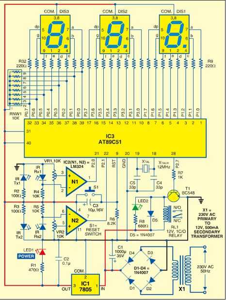 Cuando alguien entra en la habitación, el comparador salidas desciendan y Puerto pin P2.7 va alta. Transistor T1 conduce en saturación para energizar el relé RL1. D5 diodo actúa como un diodo de rueda libre. Resistencias R9 por R32 se utilizan para limitar la corriente a través de los segmentos del display de 7 segmentos. Valores de VR1 y VR2 se utilizan para ajustar la tensión de umbral de comparadores N1 y N2, respectivamente.