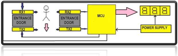 Normalmente, los comparadores en los pines 1 y 7 son altas que se dan a microcontrolador puerto pines P2.0 y P2.1, respectivamente. Cuando alguien pasa por la puerta, los rayos infrarrojos son interrumpidos y las salidas del comparador baja. Microcontroller AT89C51 incrementos/decrementos la cuenta dependiendo de la dirección del movimiento.