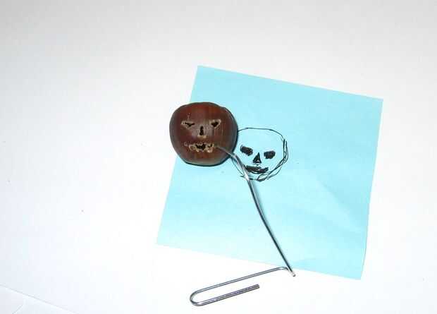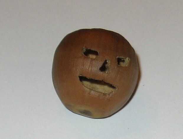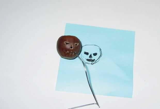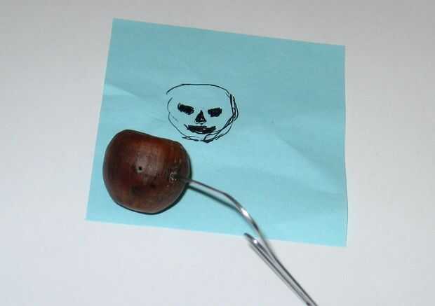 He utilizado un clip afilado que de aquí en adelante mencionaré como un ojo de la Muerte-A-maíz (TM)-Shiv o DaCES, para abreviar. Tus DaCES y perforaciones en la línea vacilante, inferior que usted dibujó. Mientras haces esto, por favor tenga en cuenta que la bellota no está hecho de hierro. No simplemente empuje tus DaCES en la bellota; necesita girar, algo así como un taladro. De hecho, si tienes un taladro pequeño poco práctico, podría utilizar. Contorno de ojos, nariz y boca. En algún momento las piezas perforadas comenzará a caer en el hueco ahora bellota. Está bueno. Esto es lo que deben hacer, y sabía que lo harían. Con la ayuda de un poco más, se hará todo el trabajo. Necesita sólo una herramienta más, y sé que sólo uno: el archivo pequeño!