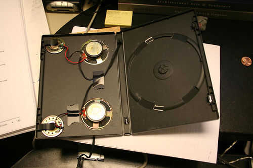 Interior solo soldar todo junto a los cables y disco 1/8 tapón a través de orificios de salida., o hacer un poco de la pisada en uno de los lados de la caja de dvd así que usted puede poner los cables para que sea fácil de transportar.