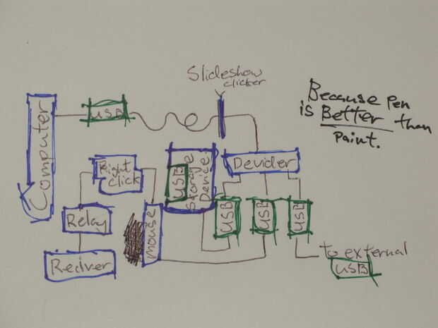 Quería crear un dispositivo que se podría utilizar como s simple inalámbrica izquierdo del ratón para uso en presentaciones de diapositivas ect. He incluido. Incluí un divisor del usb así que usted es capaz de todavía usando el puerto USB en uso para el clicker, así como dar el almacenamiento interno del dispositivo.