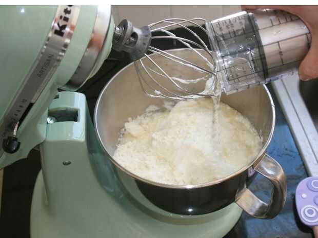Agregue el agua y la mezcla de torta y batir a velocidad media hasta que estén completamente mezclados, unos 2 minutos.