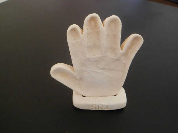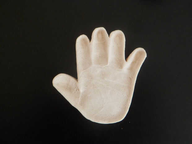 -Tomar la masa y el rodillo con el rodillo. Tomar la impresión de la mano de su bebé. Balanceo debe ser espeso. Ahora corte el borde de la impresión con el cuchillo.