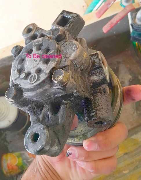 Mi viejo pero funcional dirección asistida bomba tenía una polea deformada. Ordené una nueva bomba y polea y hoy hice el cambio.Utilizando 12mm socket aflojar los dos tornillos de la bomba. También una correa de chasis quité para darme más espacio de