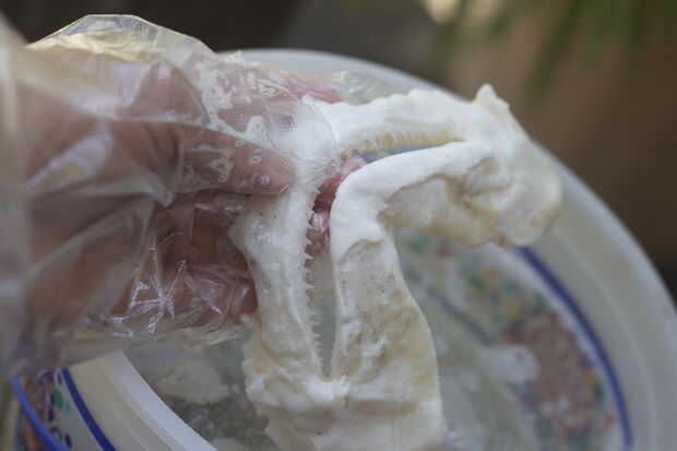 Si es necesario, deje la mandíbula remojar otra vez y repita hasta que la mandíbula está clara de la carne.