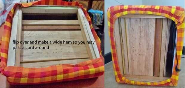 Tirón de la silla en la parte inferior y coser un dobladillo amplio por lo que puede pasar un cordón para atar para arriba. Hecho